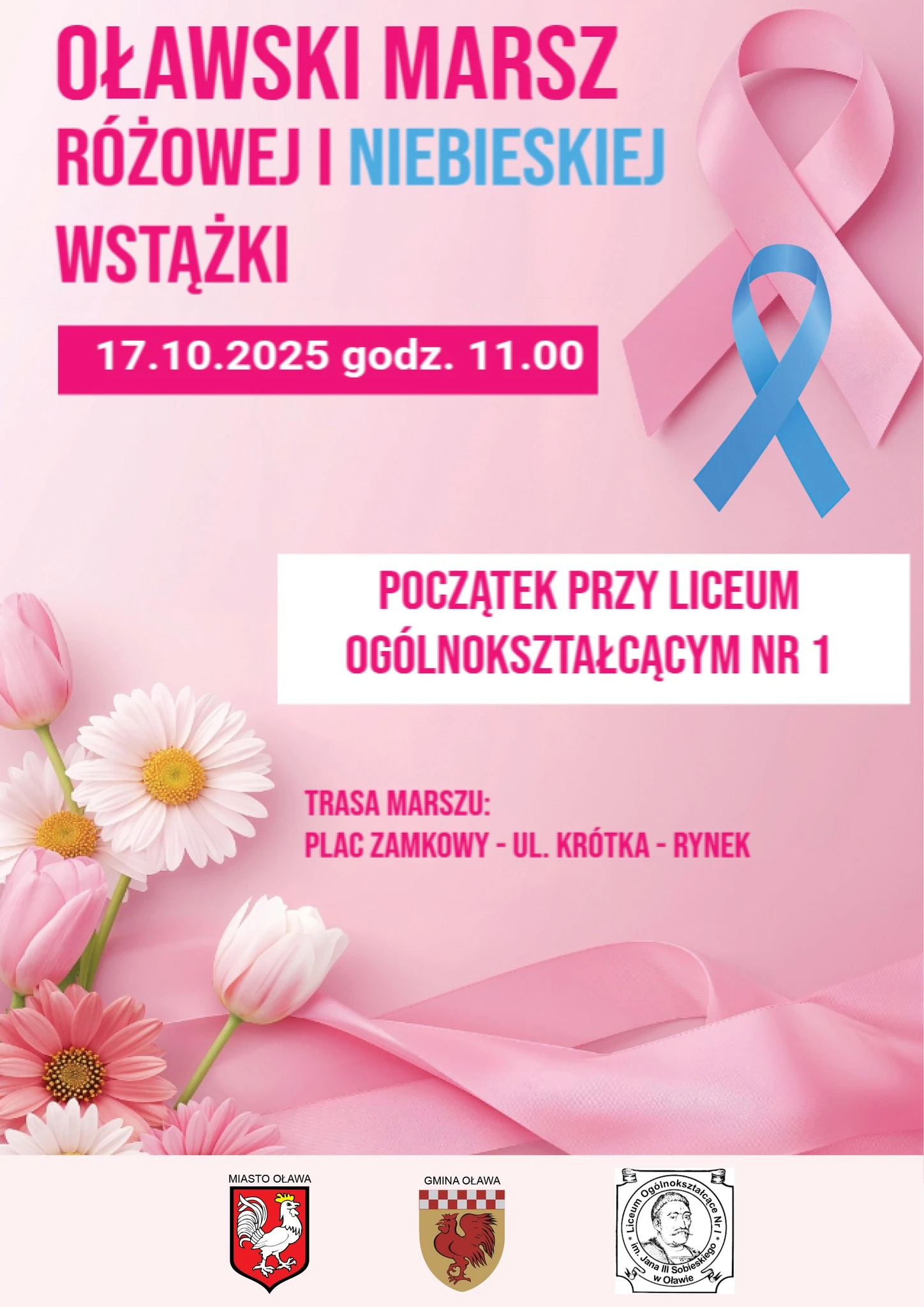 17 października ulicami Oławy przejdzie Marsz Różowej i Niebieskiej Wstążki - wydarzenie poświęcone profilaktyce raka piersi i prostaty.