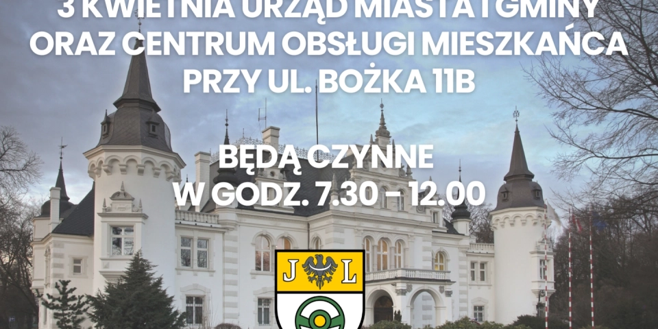 Mieszkańcy Jelcza-Laskowic powinni pamiętać, że 3 kwietnia Urząd Miasta i Gminy oraz Centrum Obsługi Mieszkańca przy ulicy Bożka 11B będą otwarte w skróconych godzinach, od 07:30 do 12:00.